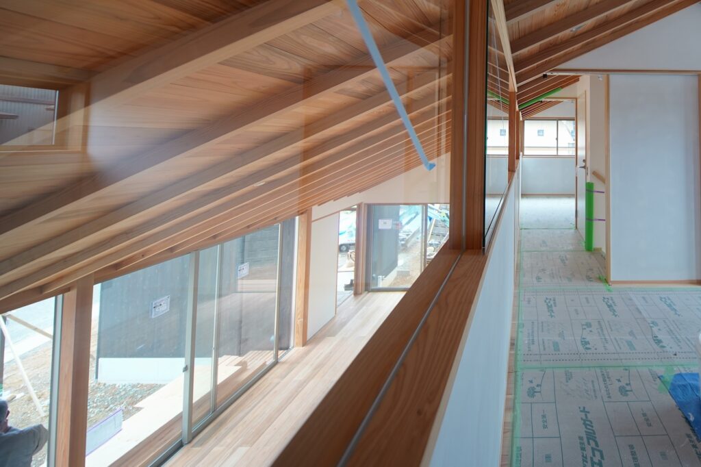 2階の子ども室から。防音のためにガラス入れて、一部風通しのために開けられます。住宅のデザインというより店舗や展示空間的かもしれないけど、住宅だからって、個室の箱を並べて、窓や出入り口の穴を開けて、なんてハウスメーカー的なつまらない発想で家を作るなんて、もったいないと思いますよ。
