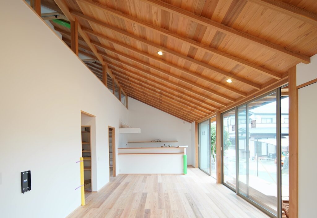 外観の高さを抑えた見え方に対し、中はこんな感じで明るく伸びやかな感じです。平屋続きだったので自分なりに悩みつつ、最近のテーマの天井をどこまでも繋げる、をやってみました。