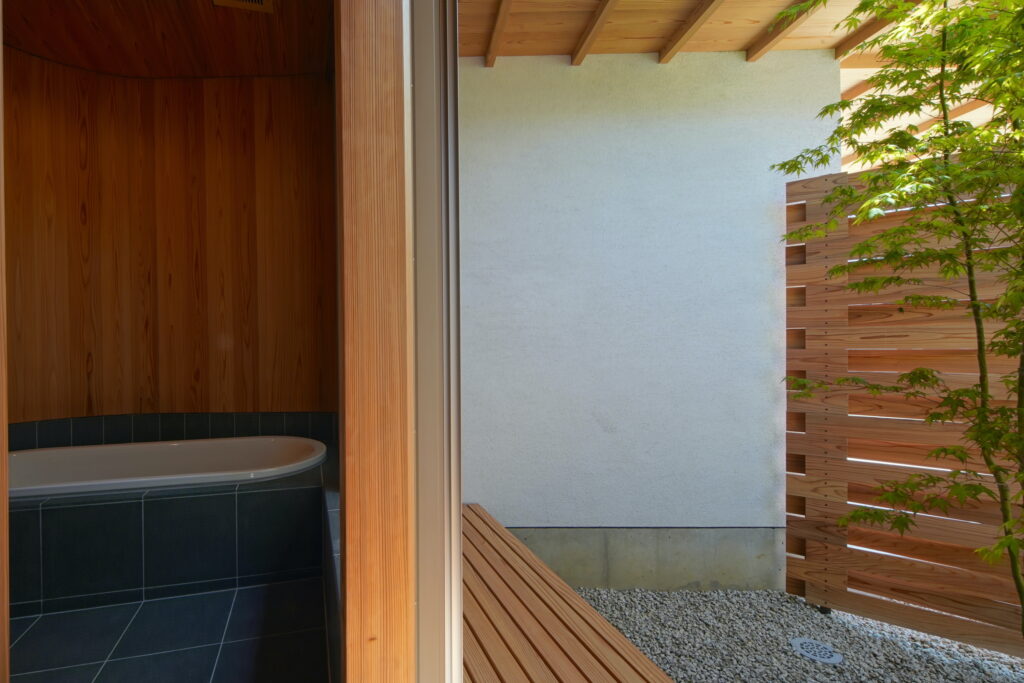 外部には寡黙に閉じつつ、大きな中庭はリビングや生活動線などを開放的に繋ぎ、浴室洗面用に小さくも気持ち良い広がりのある中庭を独立して作った。